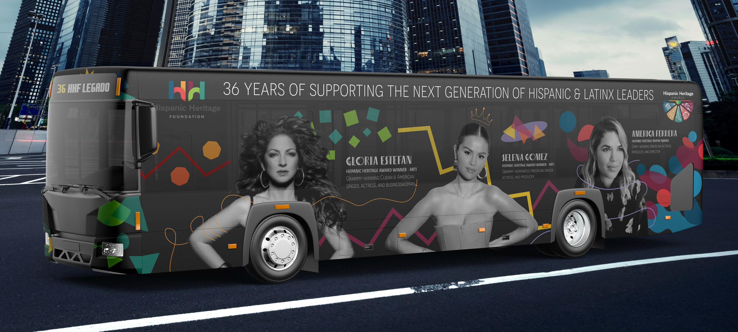I also crafted a much larger design honoring three inspiring and influential Latina leaders — Gloria Estefan, Selena Gomez, and America Ferrera — that was created from assets for the social media graphics. The illustrious spread was placed on a city bus mockup to show how this campaign could extend from social media with a more profound impact and larger reach to the audience through advertising in the real world.